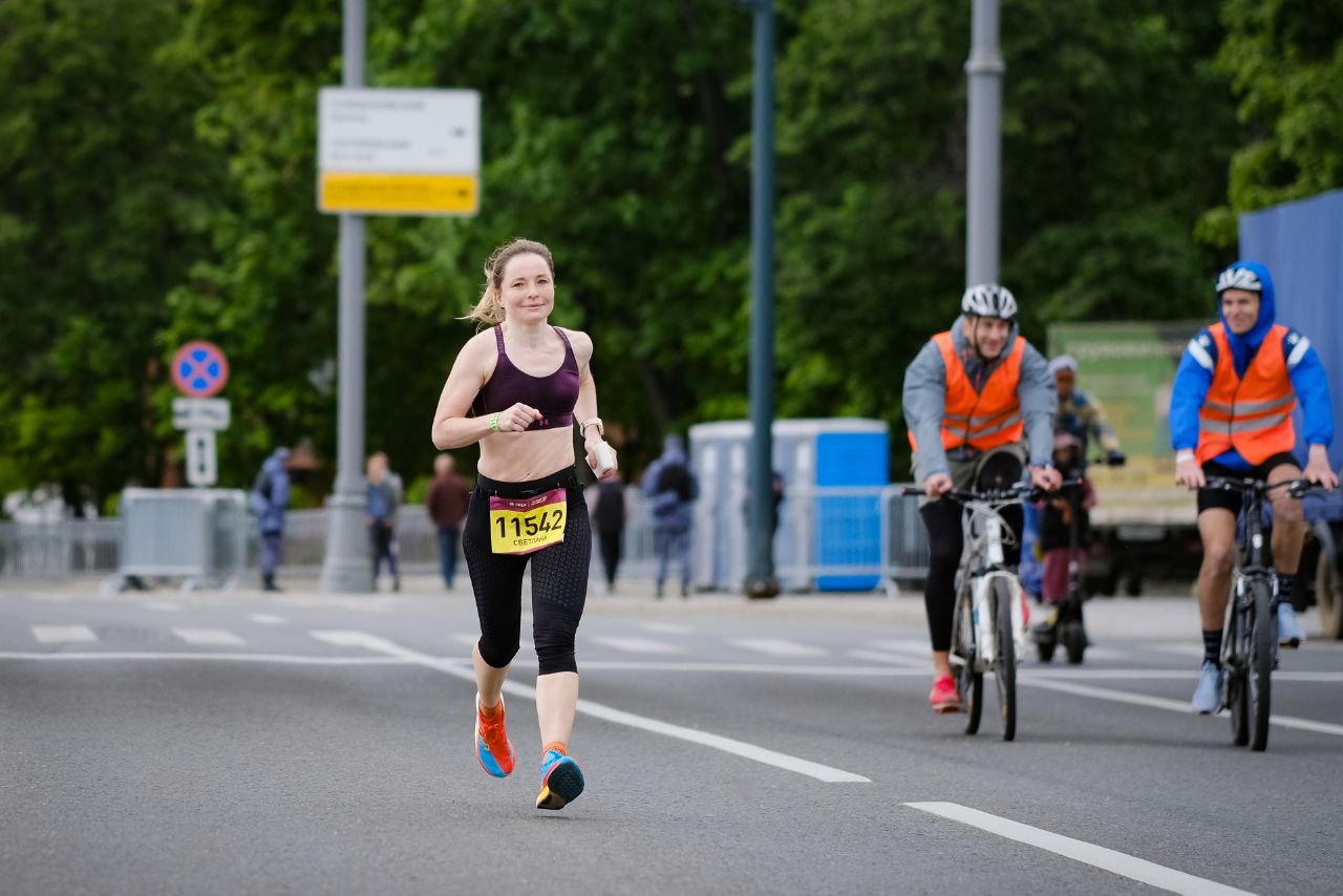 У меня были переживания о том, как пройдёт гонка, какой будет погода, но всё сложилось – 15-16 градусов без солнца, терпимый ветер и достаточно плоская трасса. На забеге я испытала интересные ощущения – на подобных стартах на длинных дистанциях участников немного и получается, что ты бежишь по центру перекрытой Москвы и всё это будто ради тебя, есть возможность насладиться моментом!